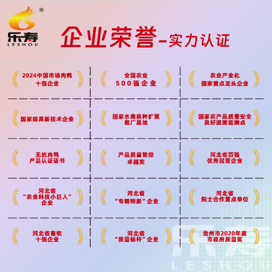 2025年:河北乐寿鸭业有限责任公司荣获河北省优秀民营企业、河北省优势种业企业;5月14日通过“无抗肉鸭”产品认证;5月18日河北乐寿鸭业有限责任公司出口车间改造工程竣工投产!