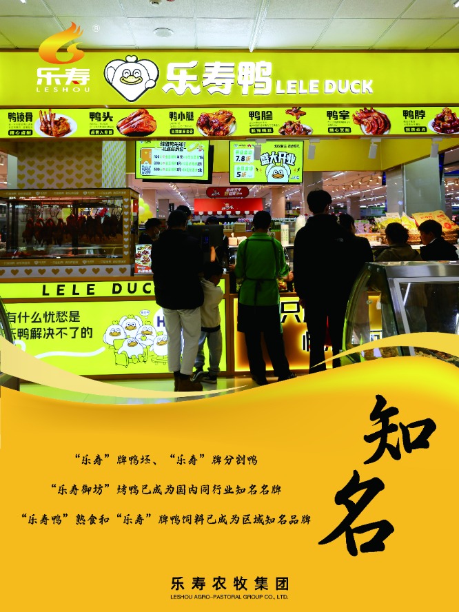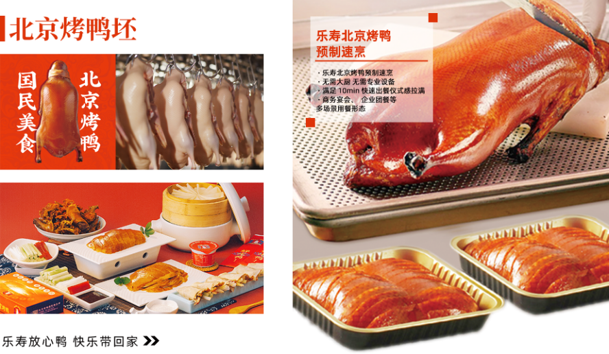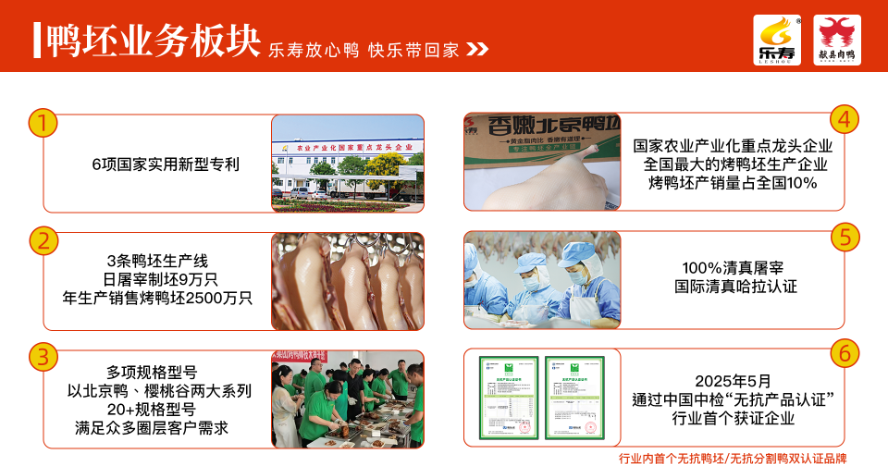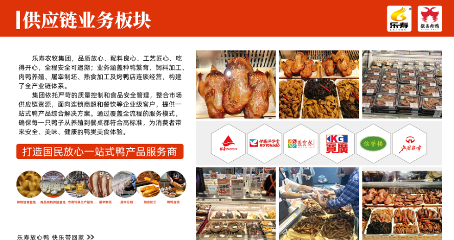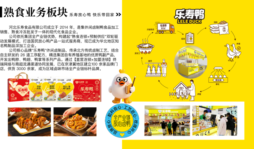 "乐寿鸭"休闲卤制品,传承北方传统卤制工艺,结合自主研发的26道工序配方,精选集团自有养殖基地的优质鸭副产品,开发出鸭脖、鸭翅、鸭掌等系列产品。通过【直营连锁+加盟连锁】终端网络与商超流通渠道协同发展,已在京津冀地区建立100余家品牌门店,供货3000余家,成为区域卤味市场标杆品牌。