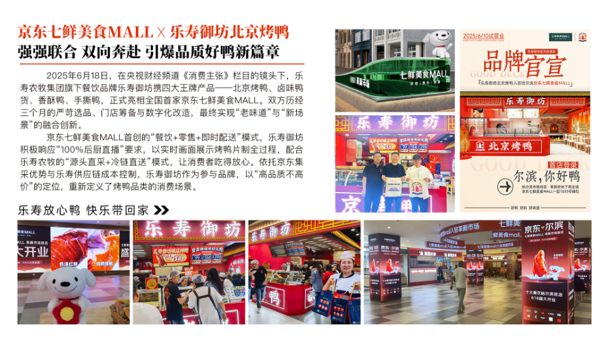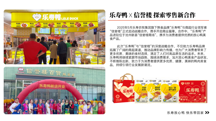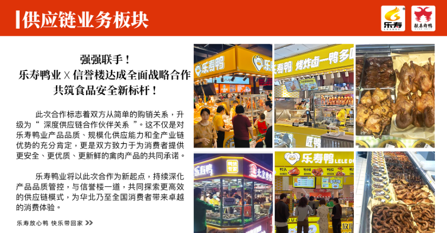 公司旗下品牌“乐寿鸭卤味熟食”“乐寿御坊北京烤鸭”与“信誉楼”、“伊藤洋华堂”、“家家悦”、“宽广超市”等多家知名连锁商超达成深度战略合作。